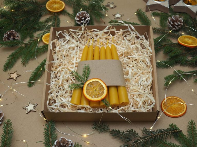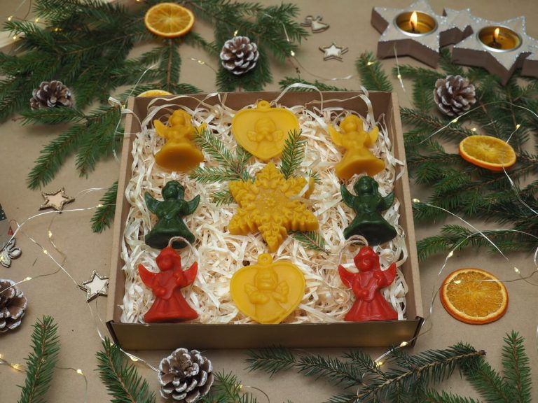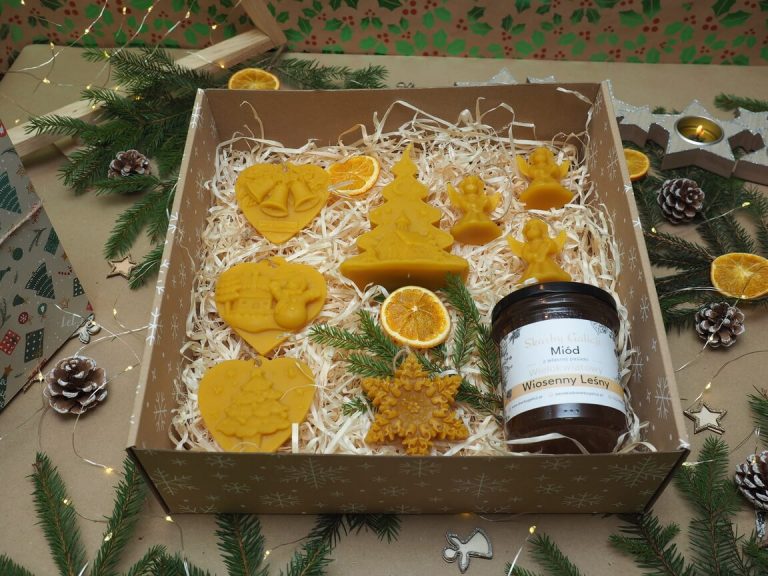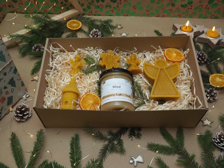 Opis: świeca anioł, świeca ul, 2 aniołki zawieszki, zawieszka gwiazdka, miód.